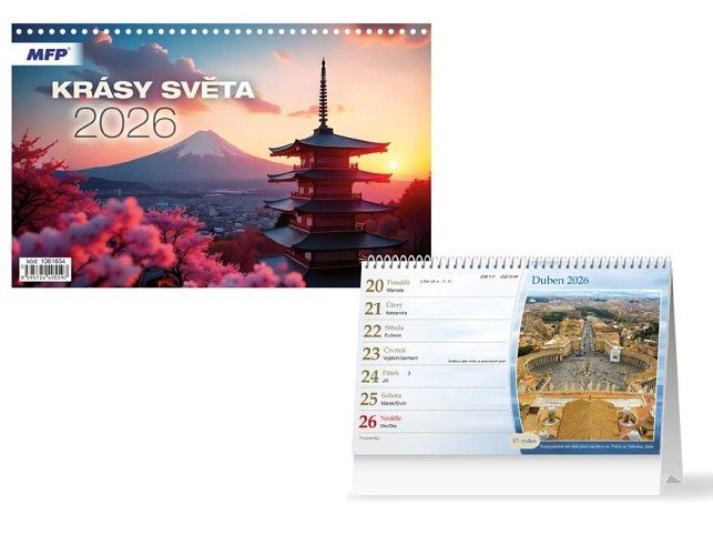 Stolní kalendář na rok 2026 s názvem Krásy světa. Kochejte se fotkami krásných míst z celého světa a inspirujte se, kam na dovolenou. Vhodný k organizování různých událostí každodenního života. Možnost dotisku firemního loga a textu na spodní stranu kalendáře.