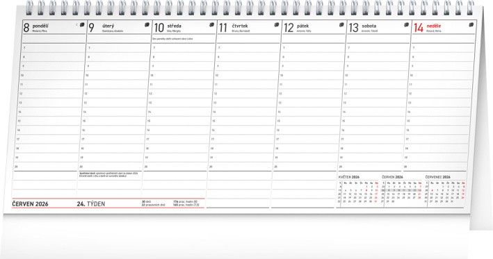 Stolní kalendář se sloupcovým kalendáriem obsahuje všechny termíny daňových povinností, česká jména, svátky a památné dny a tříměsíční přehled u každého týdne. Přehledně si naplánujete svůj čas, u každého dne je dostatek prostru na poznámky.