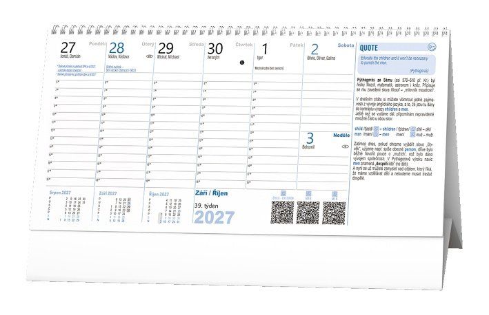 Informace o kalendáriu: měsíční fáze, roční období, letní a zimní čas, mezinárodní svátky, daňové termíny CZ, tabulkový přehled 3 měsíců, místo na poznámky, česko-anglické fráze a slovíčka s QR , časové plánování