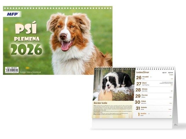Stolní kalendář na rok 2026 s názvem Psí plemena. Kalendář je určený pro milovnice a milovníky psů. Vhodný pro zapisování důležitých poznámek, k organizování různých událostí každodenního života. Možnost dotisku firemního loga a textu na spodní stranu kalendáře.