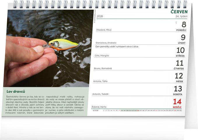 Zajímají vás nejnovější trendy ze světa rybářského sportu? Pak jistě oceníte náš stolní rybářský kalendář. Dozvíte se o rybách i výbavě, kterou by měl každý rybář mít a znát, i tom, jak vypadá život člověka, který rybařinou doslova žije. Kalendář doplňuje české týdenní kalendárium se jmény, svátky a památnými dny, fázemi měsíce a rozšířený seznam jmen.