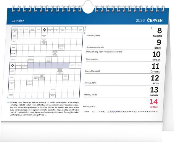 Stolní kalendář s křížovkami na každý týden. Díky háčku ho můžete zavěsit na stěnu či ponechat na stole. Obsahuje české kalendárium se jmény, svátky a památnými dny, měsíční přehled a dostatek prostoru na poznámky.