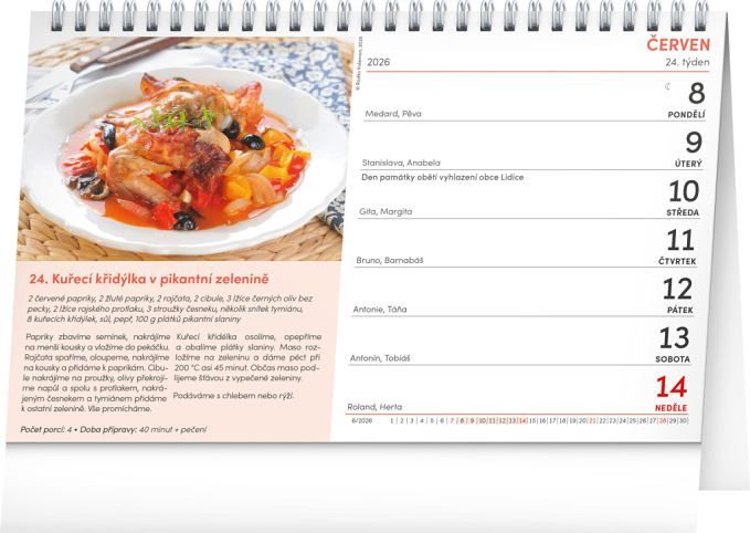 53 receptů na světoznámá jídla ze středomořské kuchyně. Zkuste si připravit každý týden jiný pokrm z této nabídky! Týdenní kalendárium s prostorem pro poznámky obsahuje také svátky, památné dny, měsíční fáze a přehled na celý rok 2026 a 2027.