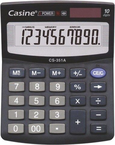 Stolní kalkulátor s 10-ti místným displejem pod úhlem, s plastovou klávesnicí pro dlouhou životnost, automatické vypnutí, výpočet %, +/-, paměť, tlačítko posuns doprava. Rozměry: 12,5 x 10 x 2,7 cm. Zdroj: solární a baterie LR1130 x 1