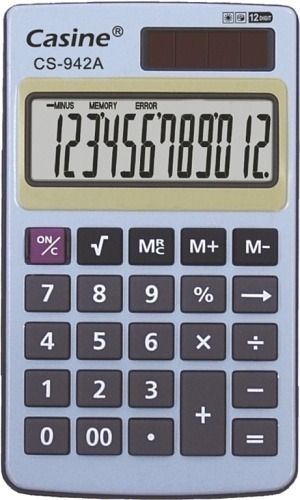 Kapesní kalkulátor s 12-ti místným displejem, s pokovenou vrchní částí těla a s gumovou klávesnicí pro pohodlné zadávání, ochranné pouzdro, automatické vypnutí, výpočet %, odmocnin, paměť, tlačítko posunu doprava. Rozměry: 11,7 x 7 x 1,2 cm. Zdroj: solární a baterie LR1130 x 1