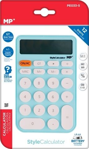 12ti místná stolní kalkulačka. Napájí 1 baterie LR-44 (je součástí balení). Kulaté a oválné klávesy. Tlačítko součtu (GT). Paměťové klávesy: MRC, M+, M-. Tlačítko pro vymazání poslední číslice. Rozměry: 87 x 140 mm.