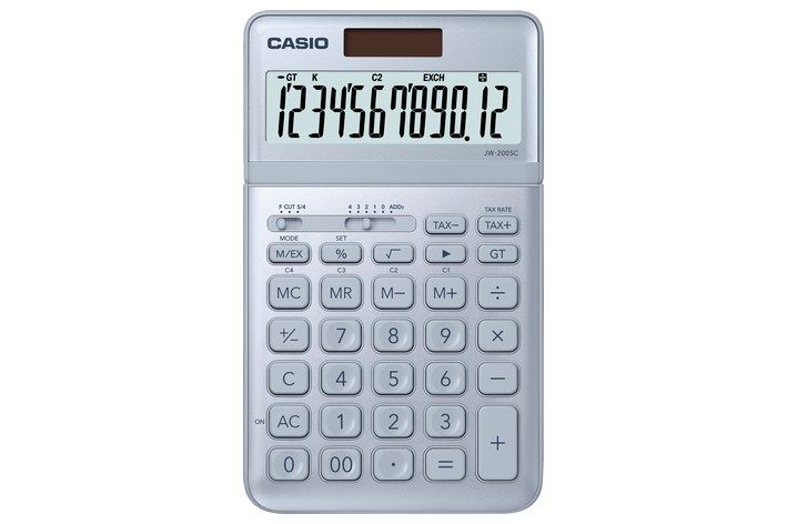 Designový stolní kalkulátor Velký, přehledný a naklápěcí 12ti místný LCD displej Výpočet procent Výpočet DPH Přepočet měny Výpočet % zisku Celkový součet Výřez Nastvení desetinných míst Tlačítko opravy zadání Tlačítko dvojité nuly Nezávislá paměť Napájení: Duální solár/bateriové Rozměry: 1,1x109x184mm