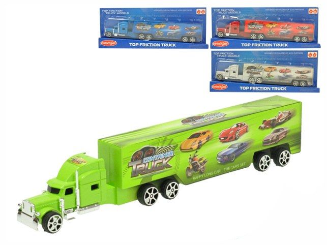 Kamion o velikosti 23cm na zpětný chod si mohou děti vzít s sebou kamkoliv jen budou chtít. Vlečka kamionu je odpojitelná. K dostání je ve čtyřech různých barvách.