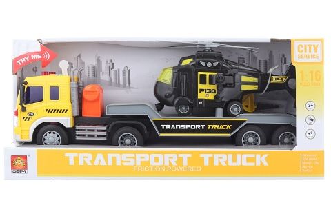 Kamion s helikoptérou na baterie. Po stisknutí tlačítek kamion vydává zvuky a svítí. Rozměry kamionu cca 40 x 11 x 8 cm. Rozměry balení cca 42 x 18 x 12 cm. Napájení na 3 AG13 (jsou součástí balení). Věk 3+