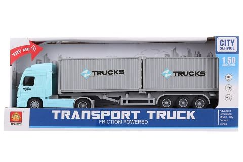 Plastový kamion s přepravními kontejnery na baterie v měřítku 1:50. Po stisknutí tlačítka kamion vydává zvuky a svítí. Napájení 3x AG13/LR44 baterie - jsou součástí balení. Rozměr balení cca 36,5 x 15 x 7,5 cm. Věk 3+