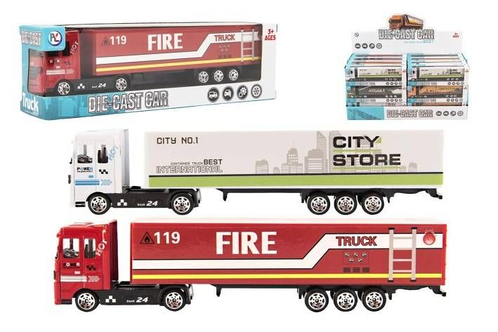 Kamion s návěsem 19cm kov/plast na volný chod 4 barvy v krabičce 20x6x4cm