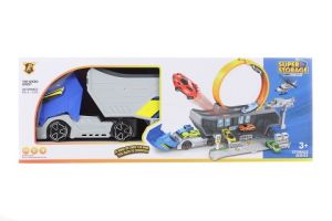 Sada obsahuje velký kamion, dráhu a 2 autíčka. Po rozložení kamion funguje ve spodní části jako základna, v horní jako prostor pro dráhu. Autíčko se vystřeluje pomocí gumiček umístěných v zadní části kamionu. Materiál plast. Baleno v krabici. Rozměry balení cca 47x17x10 cm. Věk 3+
