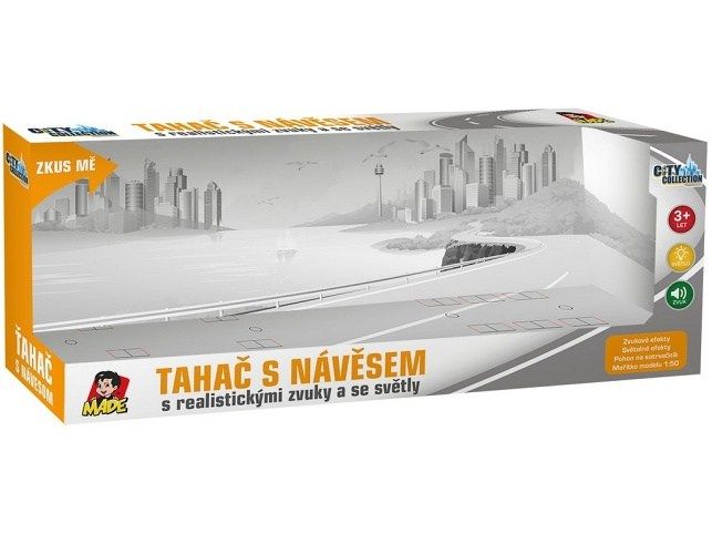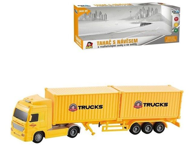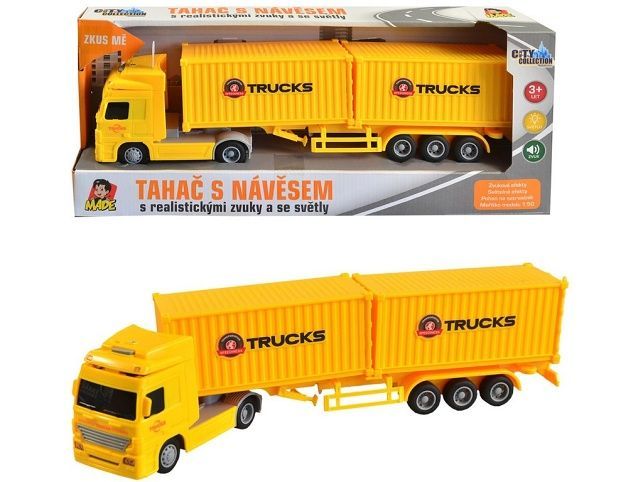 Kamion se dvěma kontejnery na setrvačník se světelnými a zvukovými doplňky z kolekce City collection. Český box o rozměrech 36,5 x 7,5 x 14,5 cm. Kamion má rozměry 8 x 33 x 5 cm. Měřítko 1:50. Pohon na setrvačník, světelné a zvukové doplňky. Napájení: baterie 3 x AG 13 knoflíkové (jsou součástí). Vhodné pro děti od 3 let.