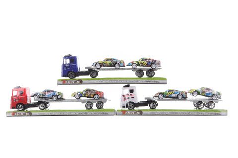 Kamion přepravující závodní auta na setrvačník. Materiál plast. Baleno v plastové krabičce. Rozměry balení cca 32x9x6 cm. Věk 3+