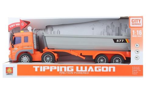 Kamion sklápěčka na baterie. Po stisknutí tlačítek kamion vydává zvuky a svítí. Rozměry kamionu cca 40 x 11 x 8 cm. Rozměry balení cca 42 x 18 x 12 cm. Napájení na 3 AG13 (jsou součástí balení). Věk 3+