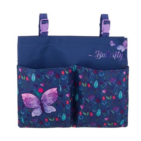 Školní kapsář na lavici s motivem motýla. Do hlavní kapsy se vejdou sešity a učebnice až do velikosti formátu A4. Do dvou předních kapes (22 x 18 cm) se pohodlně vejdou ostatní školní pomůcky. Zapínání na přezku.