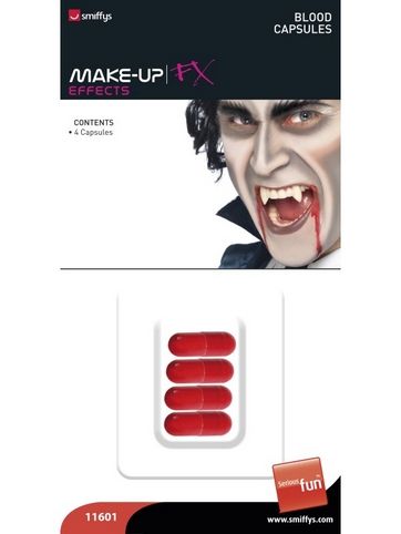 4 kapsle falešné krve v balení. Umělou krev použijete např. pro dotvoření make-upu na Halloween, hororovou párty nebo na karneval. Jedná se o želatinové tobolky