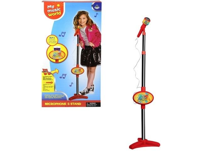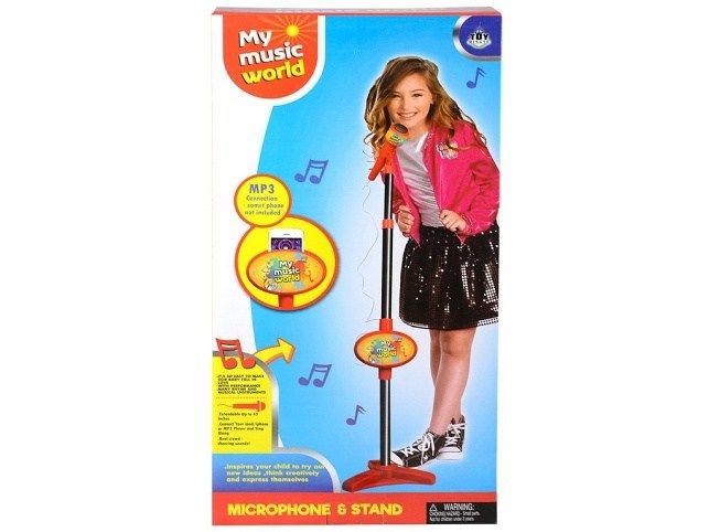 Skvělá zábava pro malé zpěváky je mikrofon na baterie, ke kterému je možné připojit externí audiozařízení. Staň se hvězdou pódií. Připoj k řídící jednotce stojanu MP3 přehrávač nebo chytrý mobilní telefon a zpívej společně se svým oblíbeným zpěvákem nebo zpěvačkou známé písničky. Výška stojanu cca 105 cm. Napájení: baterie 3x AA 1,5 V. Rozměr boxu: 20 x 39 x 7 cm. Vhodné pro děti od 3 let.