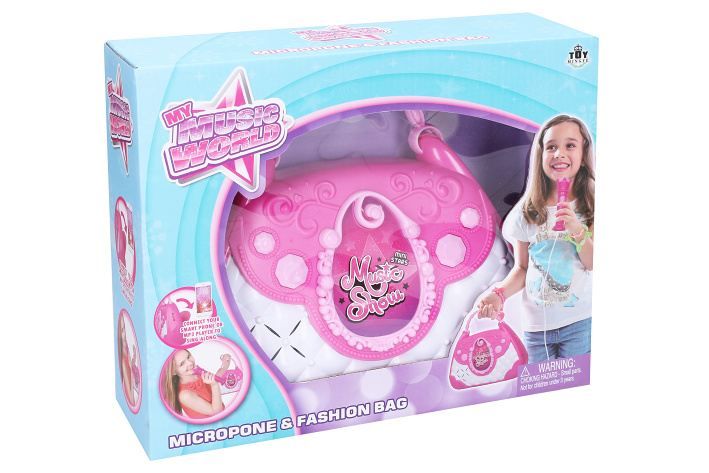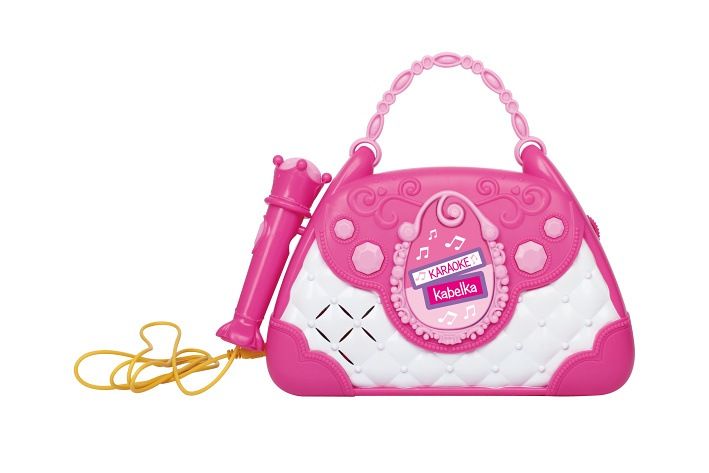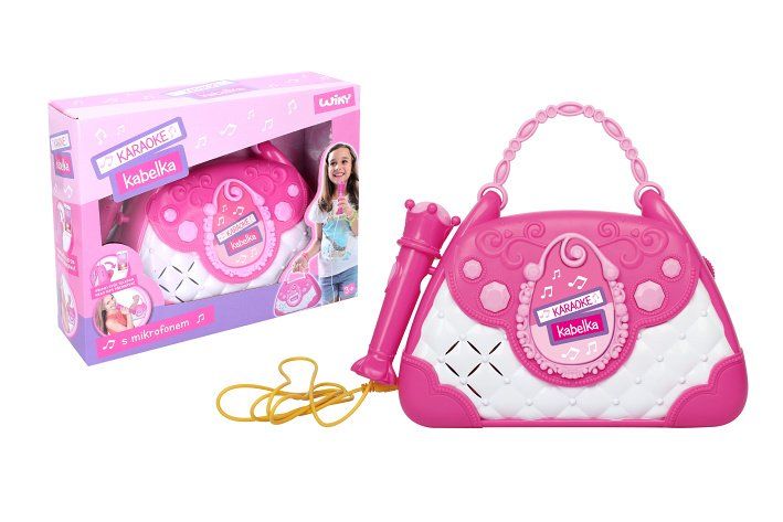Karaoke kabelka. Světelné a zvukové efekty. Součástí mikrofon, vstup pro telefon a mp3 přehrávač, 2 tlačítka - efekt potlesku, vestavěné melodie. Přepínač ON/OFF. 3xAA baterie nejsou součástí.