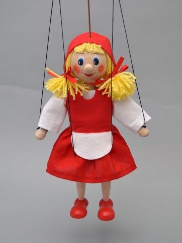 Dřevěná loutka s jednoduchým vodícím křížem, umožňujícím snadné ovládání pro děti i dospělé.