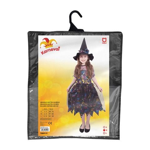 Karnevalový kostým pro malé čarodějnice! Kostým černo-fialové barvy ve velikosti M je určen pro holčičky ve věkovém rozmezí 6-8 let. Šaty jsou dekorovány barevnými halloweenskými motivy. Součástí kostýmu je perfektně sladěný čarodějnický klobouk. S tímto úchvatným kostýmem se zaručeně staneš hvězdou karnevalu i Halloweenu!