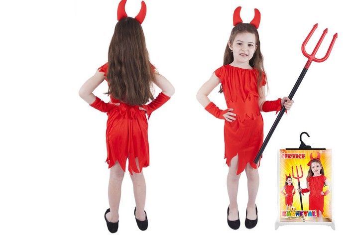 Pekelný karnevalový kostým s motivem čertice v zářivé červené barvě ve velikosti M je určen pro holčičky ve věkovém rozmezí 6-8 let (116-128cm). Balení obsahuje šaty, čelenku s rohy, návleky na ruce a pásek.