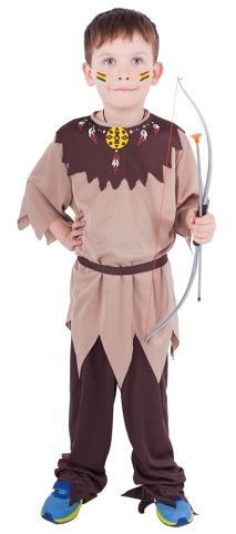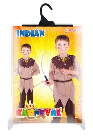 Stylový karnevalový kostým s motivem indiána! Kostým hnědé barvy ve velikosti S je určen pro chlapečky ve věkovém rozmezí 4-6 let (110-116 cm). Balení obsahuje horní díl s indiánským vzorem, kalhoty a pásek.