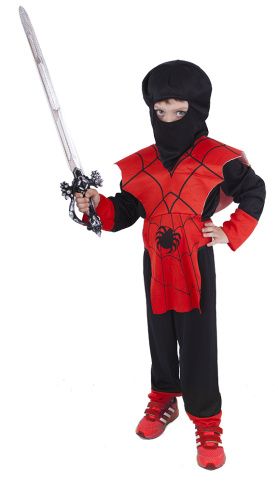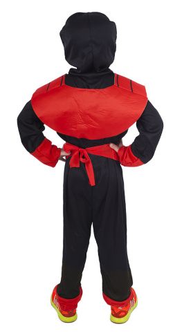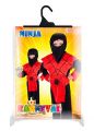 Karnevalový kostým NINJA ve velikosti M je určen pro chlapce ve věkovém rozmezí 6-8 let (116-128 cm). Balení obsahuje overal, vestu, kuklu, čelenku a opasek. Červené prvky kostýmu jsou dekorovány pavoukem a pavučinami.