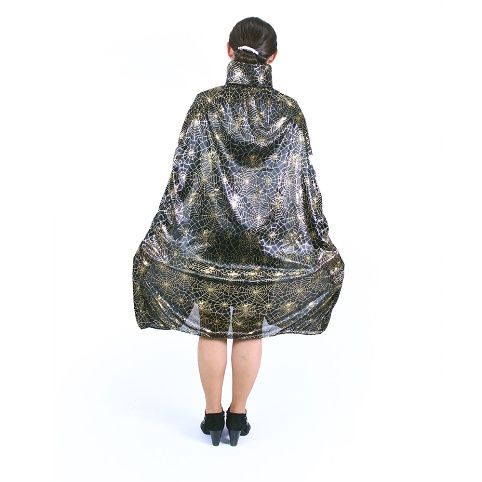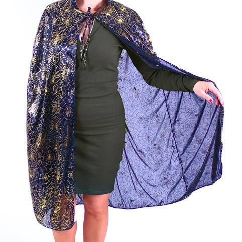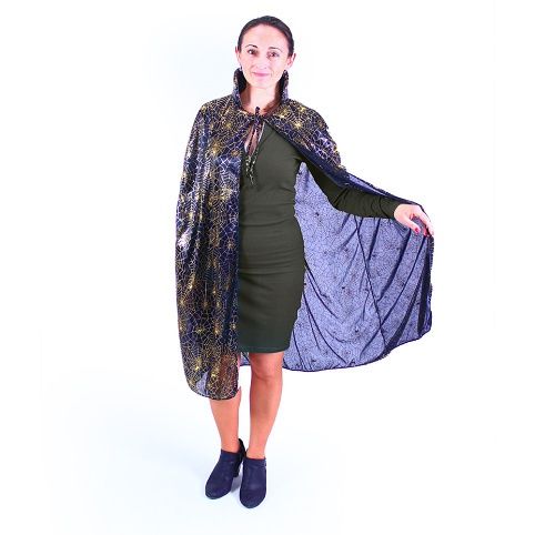 Úžasný černý plášť pro všechny čaroděje a čarodějnice! Plášť na zavazování je určen pro dospělé. Tento stylový kousek je dekorován potiskem zlatých pavučin. Plášť je dlouhý cca 104 cm.