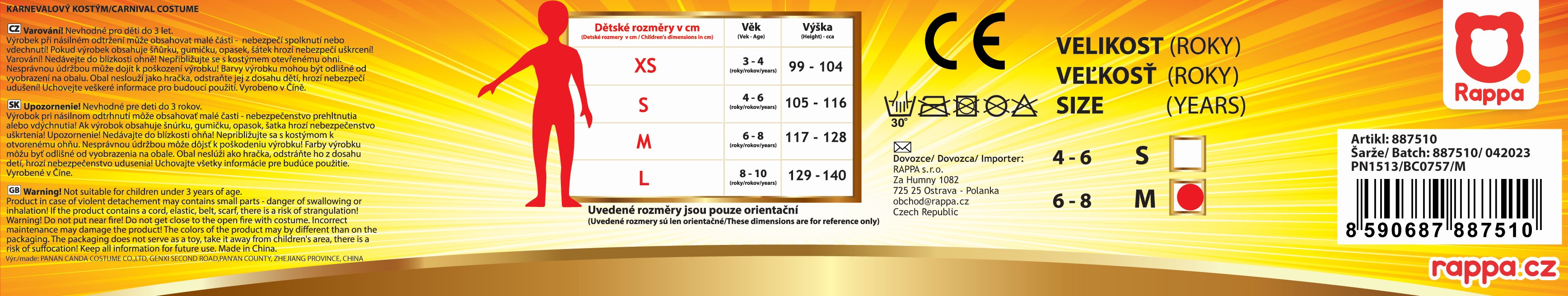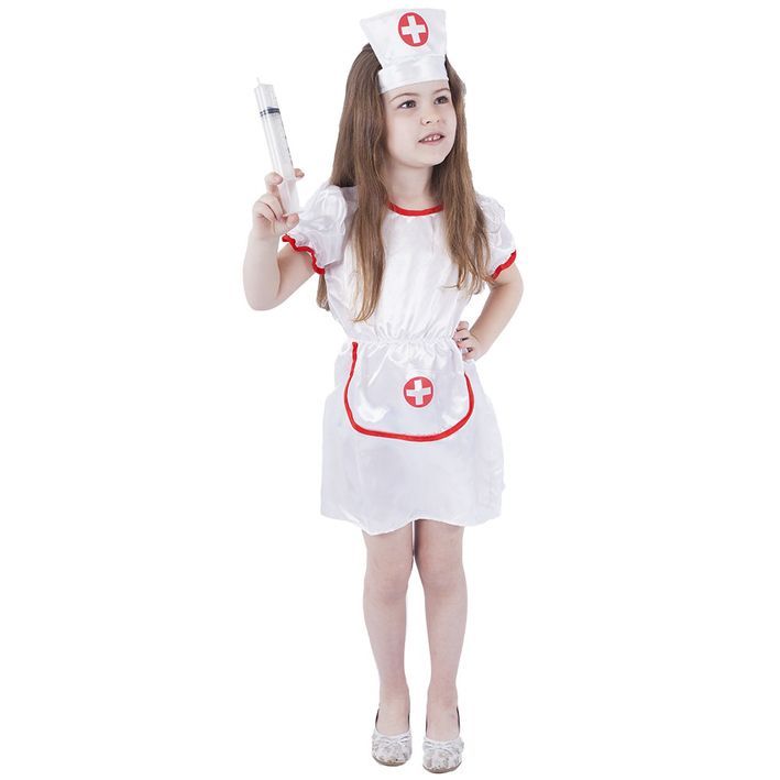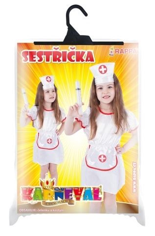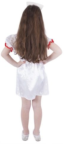 Krásný karnevalový kostým pro malé zdravotní sestřičky. Kostým velikosti M je určen pro děvčata ve věkovém rozmezí 6-8 let (116-128 cm). Sada obsahuje šaty a čepici.