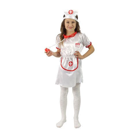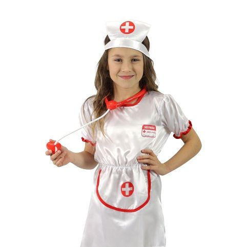 Krásný karnevalový kostým pro malé zdravotní sestřičky. Kostým velikosti M je určen pro děvčata ve věkovém rozmezí 6-8 let (116-128 cm). Sada obsahuje šaty a čepici.