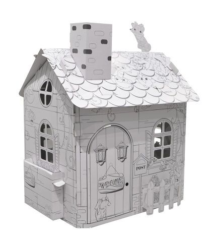 Kartonový domeček s dětskými motivy je celý černobílý a jeho stěny slouží k vymalování. Barevné provedení je zcela na fantazii dítěte. Domeček má otevírací okna i dveře a následně může sloužit jako skrýš pro hračky. Součástí balení je 6 ks popisovačů. Rozměr 54 cm x 45 cm x 64,5 cm.