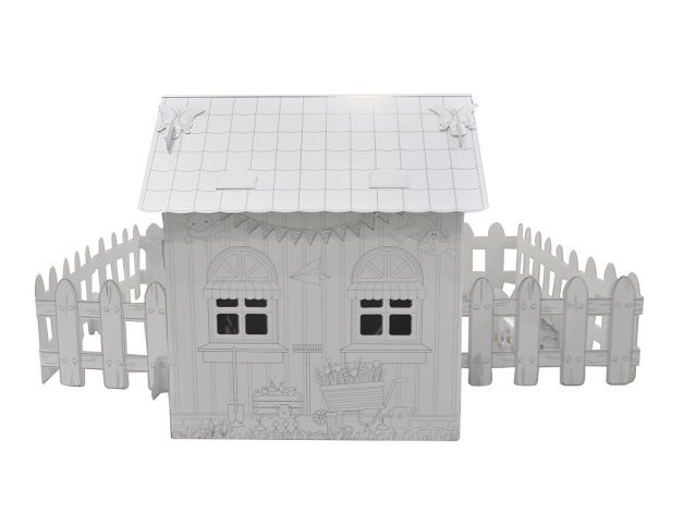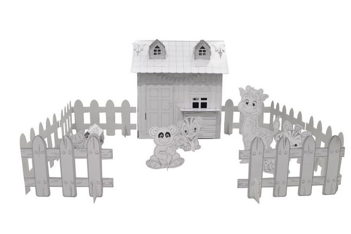 Kartonový domeček s dětskými motivy včetně ohrádky s 5 zvířátky je celý černobílý a slouží k vymalování. Barevné provedení je zcela na fantazii dítěte. Domeček má otevírací okna i dveře a následně může sloužit jako skrýš pro hračky. Součástí balení je 6 ks popisovačů. Rozměr 108 cm x 94 cm x 57 cm.