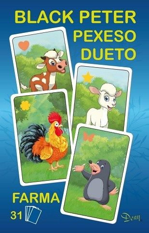 Černý Petr klasická karetní hra s obrázky. Hra se skládá z 31 karet, které jsou rozděleny do 15 dvojic, z nichž je každá dvojice označena stejným obrázkem. Pouze jediná karta se od ostatních liší a to je Černý Petr . Vyhrává ten, kdo bude mít dvojice vyloženy nejdříve. Prohrává ten, komu zůstane v ruce Černý Petr. Hry se můžou zúčastnit nejméně 3 hráči. Součástí balení je 31 karet a 1 návod. Tento karetní set si oblíbí všechny děti milující zvířátka z farmy.
