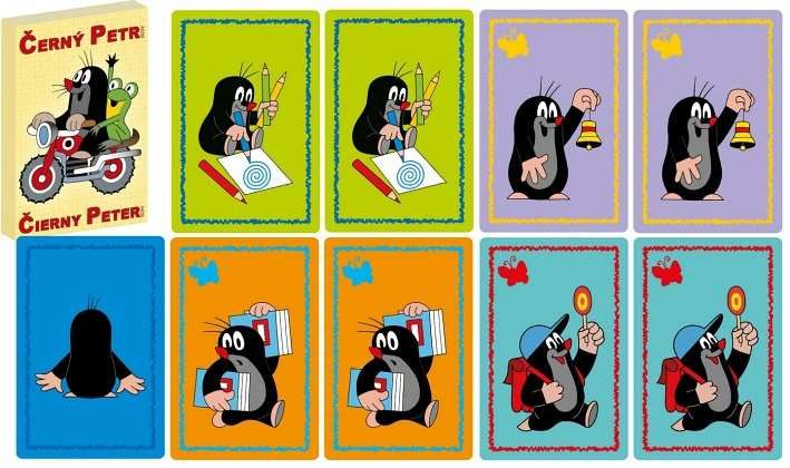 Dětské karty pro hru zvanou Černý Petr s obrázky Krtečka od ilustrátora Zdeňka Milera. Krabička obsahuje i podrobný návod a karty mají na rubové straně mírně zdrsnělý povrch pro lepší manipulaci s nimi.