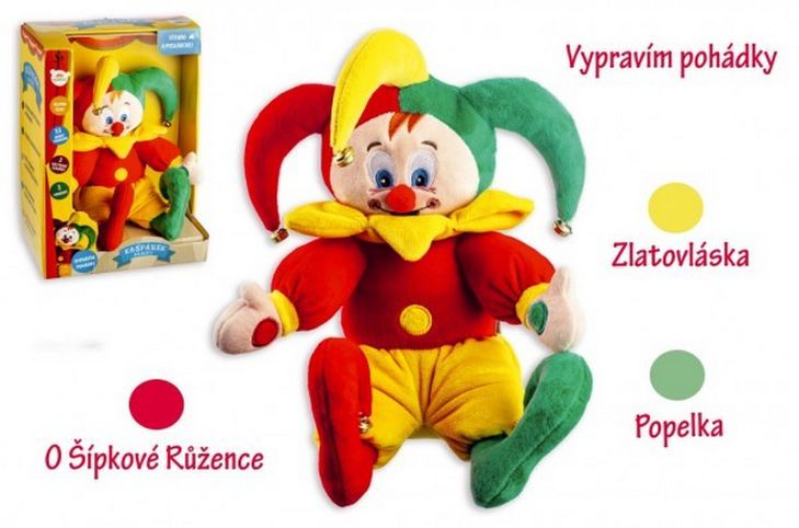 Kašpárek mluvící pohádky plyš 30 cm na baterie v krabici 26x36x15cm