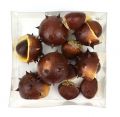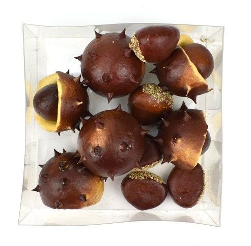 Tyto kaštany jsou věrnou imitací přírodních kaštanů, které mají hnědou barvu a lesklý povrch. Jsou vyrobeny z plastu a mají různé velikosti a tvary. Můžete použít jako výplň do misky, košíku nebo sklenice. Můžete je také připevnit na větvičky, věnce nebo kytice.