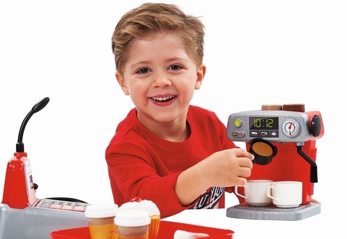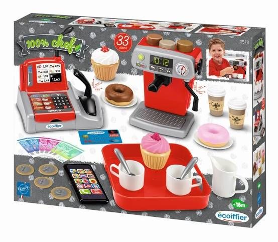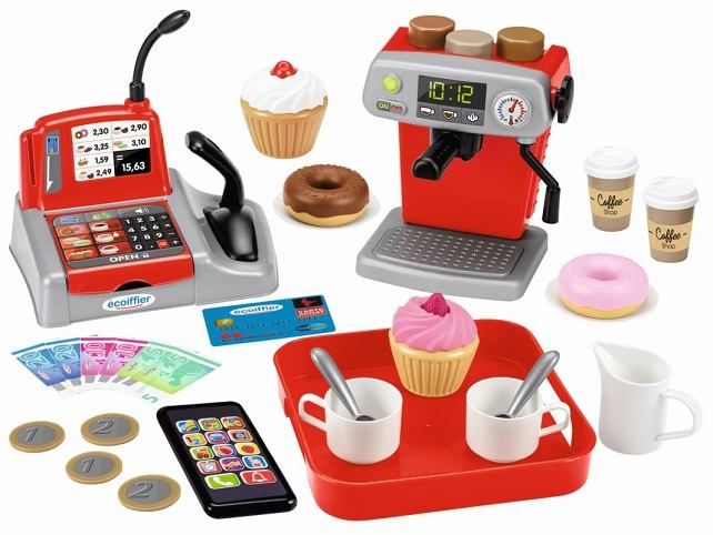 Sada obsahuje stylový přístroj portafilter s odnímatelným portafiltrem umožňuje uvařit tři různé druhy kávy. Lahodný nápoj lze podávat v šálcích na malém tácu společně s drobnými pochoutkami, jako jsou tartaletky nebo koblihy. Je tu i varianta „To Go“ v podobě malých hrnků na kávu s víčkem. Pokladna s malým mikrofonem a čtečkou čárových kódů (bez funkce) je vybavena bankovkami, mincemi a kreditní kartou a součástí je i chytrý telefon pro další objednávky. Rozměry: 50 x 21 x 40 cm.