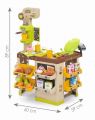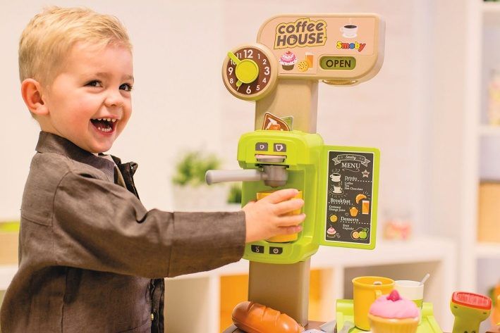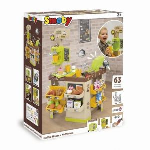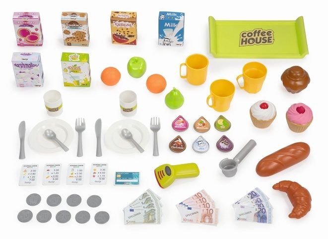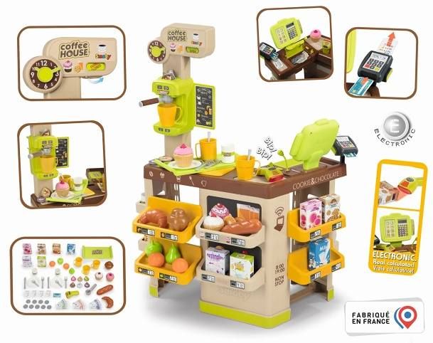 Elegantní kavárna s příslušenstvím. Denní nabídku lze napsat na tabuli. Originální kávovar na espresso s odnímatelným portafiltrem a různými typy kávových kapslí. Malé dorty, sladkosti, ovoce a makety obalů potravin lze uložit do přihrádek. K dispozici je také servírovací tác, šálky na espresso, talíře, lžíce a hrnky. Pokladna má integrovanou kalkulačku, odklápěcí přihrádku na peníze s hracími mincemi a bankovkami, skener s funkcí zvuku a světla, mikrofon (bez funkce) a čtečku kreditních karet včetně herní kreditní karty. Rozměry produktu (DxŠxV): 60 x 60 x 89,6 cm.