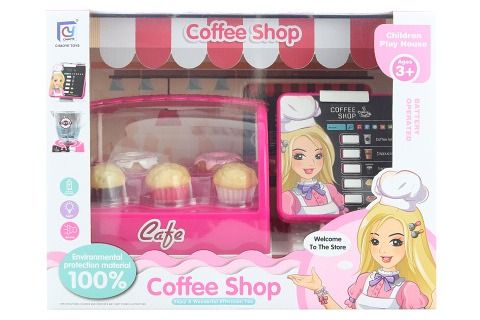 Kavárna s pokladnou a doplňky. Balení obsahuje pokladnu a chladničku s dortíky. Napájení chladničky na 3 AG13 baterie (jsou součástí) a napájení pokladny na 2 AAA baterie (jsou součástí). Rozměry balení cca 35 x 27 x 18 cm. Věk 3+