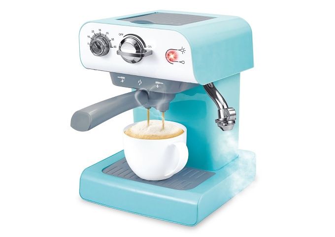 Kávovar pákový s efekty a párou. Rozměry 22x21x26. 5cm. 3xAA baterie nejsou součástí. nádržka na vodu je na horní straně kávovaru. Když páka směřuje doprava, dá se odejmout nebo přidělat. Pro zafixování dejte páku směrem dopředu. Světelné a zvukové efekty. Když se kávovar zapne a rozsvítí se kontrolka, vychází z trysky pára.
