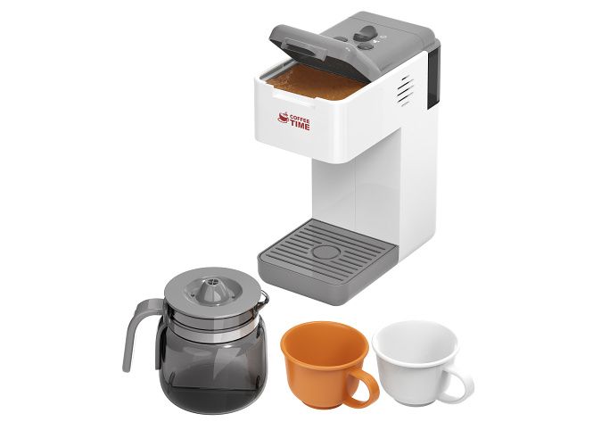 Kávovar s konvicí a tekoucí vodou. Rozměry 20x9x20cm. 2xAA baterie nejsou součástí. světelné a zvukové efekty. obsahuje kávovar, konvici a dva hrnečky. Po naplnění kávovaru vodou do nádržky nahoře vzadu kávovar napouští vodu do konvice. tlačítko on/off. Obrázkový návod na obalu.