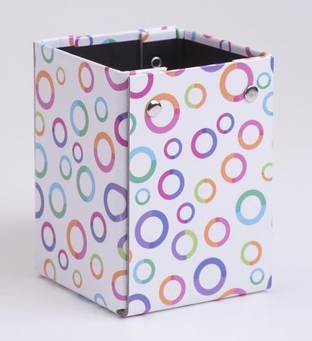Kelímek na tužky z laminovaného kartonu. Slouží k uskladnění psacích a kancelářských potřeb. Pevný, nýtovaný materiál.