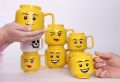 Žlutý hrnek ve tvaru hlavy LEGO minifigurky s obličejem chlapce