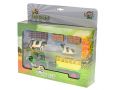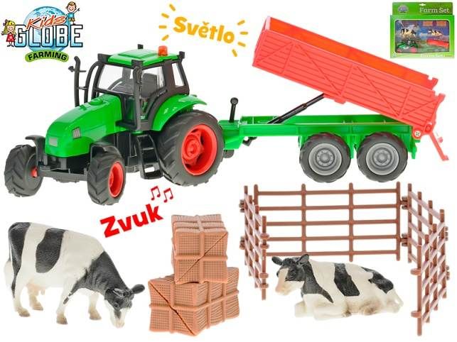 Sada obsahuje traktor s vlekem, dvě kravičky, seno a ohrádku. Za pomoci tlačítka, které je umístěno na kapotě, traktůrek svítí a vydává zvuk.