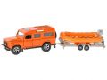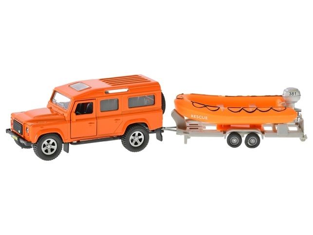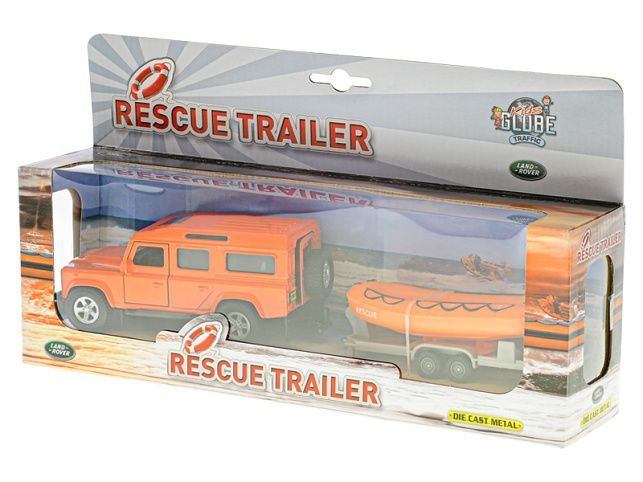 Autíčko Land Rover Defender značky Kids Globe s přívěsem, pomocí kterého lze člun snadno přepravovat. Auto má rozměr 14cm a je na zpětný chod. Přívěs lze odpojit.
