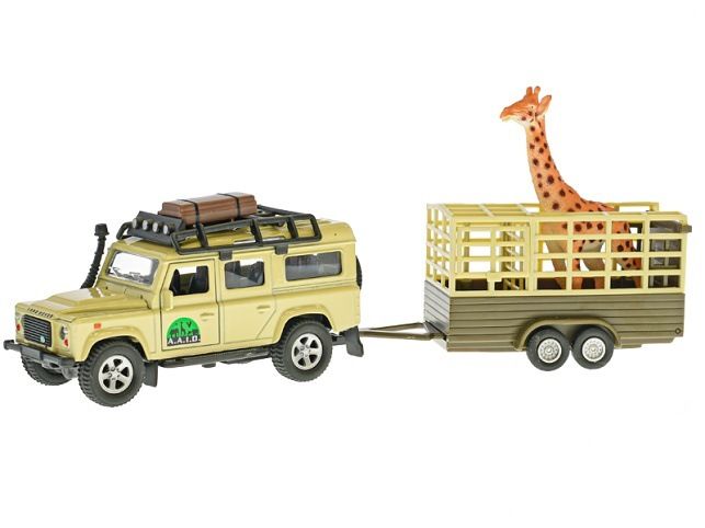Hurá do Afriky na zebry a žirafy s bezpečným autem Land Rover Defender. Auto je kovové, 14cm dlouhé a na zpětný chod. Jeho součástí je odpojitelný přívěs o velikosti 14cm k přepravě zvířat.