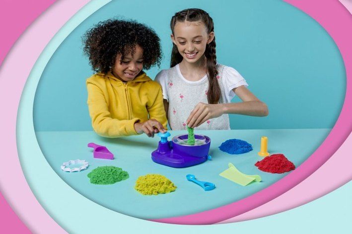 Duhový kolotoč Kinetic Sand obsahuje 900 g písku červené, fialové, zelené a žluté barvy. Zmáčkni, roztoč, naplň pískem a vytvoříš hypnotizující designy.
