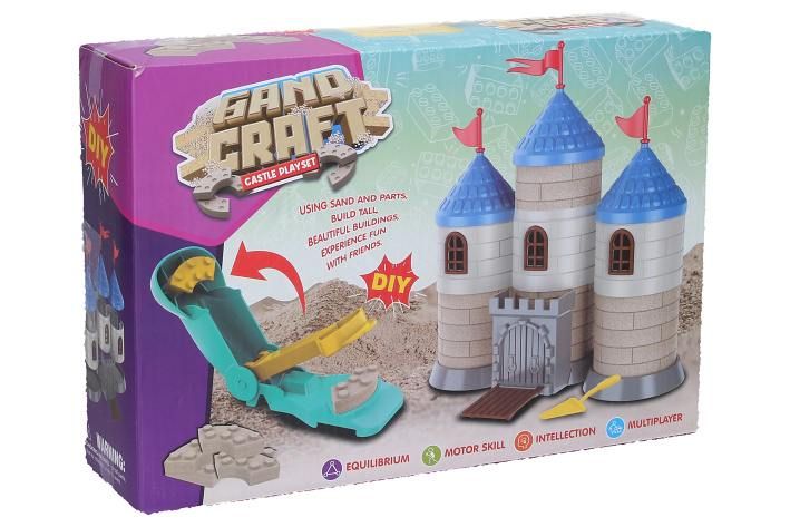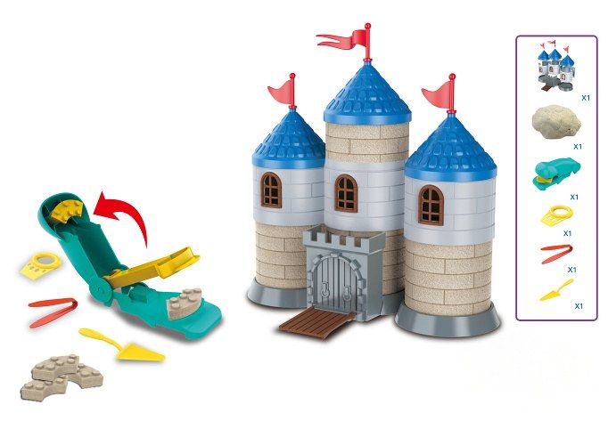 Kinetický písek sada na stavbu s cihliček Hrad. Obsah balení 750g. Obsahuje formu na tvorbu cihliček. Balení také obsahuje díly na stavbu hradu a další nástroje na práci s pískem. Obrázkový návod na zadní straně obalu. Po vytažení z formičky nechejte písek 1 minutu schnout. Pokud potřebujete menší cihličku, rozkrojte větší na půl, pomocí přiloženého nástroje.