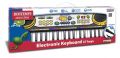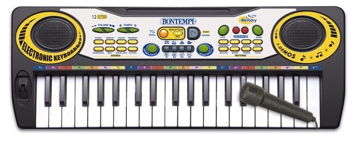 Elektronické klávesy s mikrofonem – 37 midi kláves (C-C). Přednastaveno 8 melodií, 8 rytmů, 5 přednastavených nahraných písní, 4 přednastavené zvuky bubnů, 4 rytmické variace. Můžete nahrávat a přehrávat různé tóny, předprogramovatelný rytmus. Nastavení hlasitosti zvuku, stop, tempo +/-. Efekty – ozvěna, vibrato,sustain. Zástrčka hlavní adaptér není součásí. zástrčka pro mikrofon je součástí. Provoz na baterie 4R6AA1,5 V nejsu součástí. Rozměry 42,5×16×6 cm. Na baterie: 4x AA (nejsou součástí balení)